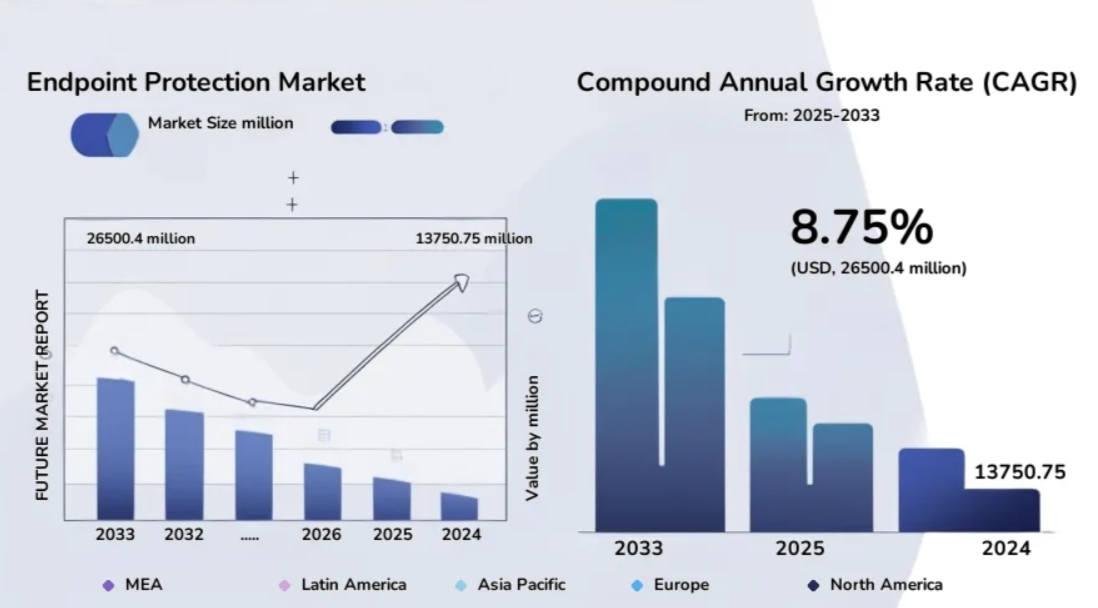 Другое исследовательское агентство ― Future Market Report приводит иные данные. По их подсчётам, размер рынка Endpoint Protection по итогам 2025 года составил 13,75 млрд $. Согласно составленным прогнозам, темп прироста составит 8,75 % и к 2032 году будет оцениваться в 26,5 млрд $.
