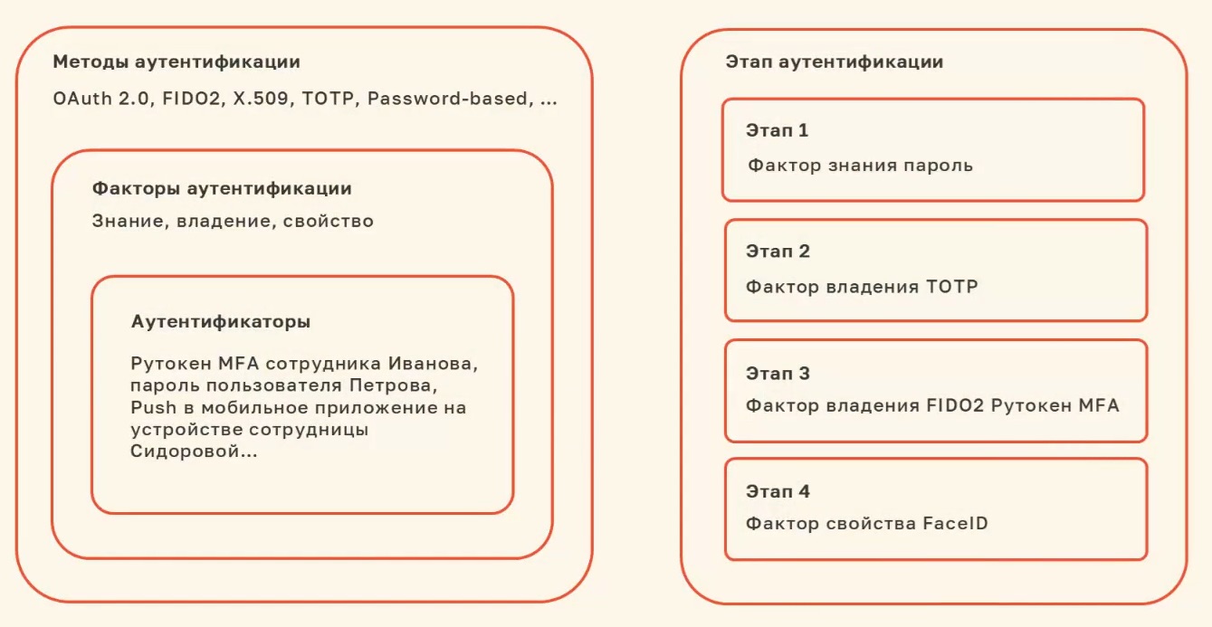 Дмитрий Грудинин рассказал о различиях между факторами аутентификации. Традиционно их 3: «что-то, что вы знаете» (например, пароль или PIN), «что-то, чем вы владеете» (например, токен или смартфон) и «что-то, чем вы являетесь» (биометрия: отпечаток пальца или лицо). Он пояснил, что аутентификатор — это конкретный экземпляр, реализующий фактор.