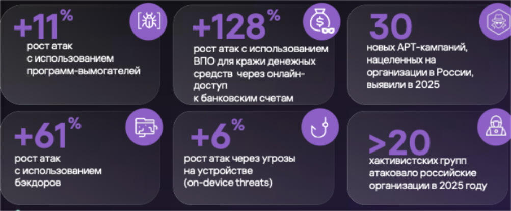 В целом в 2026 году стоит ожидать развития тенденций, заложенных в 2025 году, особенно в его второй половине. Ключевой угрозой для крупного бизнеса будут шифровальщики и вайперы, для малого и среднего — атаки класса Fake Boss, но нельзя исключить новой волны краж через системы ДБО, особенно накануне очередного налогового дедлайна.