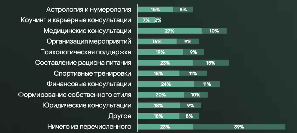 Летом 2025 года «Лаборатория Касперского» провела опрос, посвящённый основным сценариям использования ИИ россиянами (рис. 6). Как оказалось, наиболее популярными стали консультации в таких весьма чувствительных сферах, как финансы, личное здоровье, смежная область формирования оптимального рациона питания, юридические вопросы.