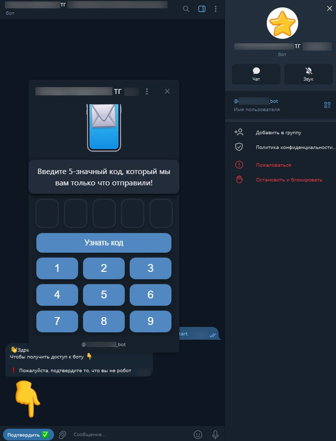 Дальше — классическая схема социальной инженерии. Под предлогом проверки пользователя просят ввести пятизначный код, который якобы отправил бот. На деле это код авторизации Telegram.