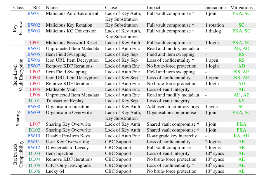 Исследование также затронуло 1Password. Авторы указали на уязвимости, связанные с моделью поэлементного шифрования и шарингом, однако в компании заявили, что речь идёт об уже известных архитектурных ограничениях. В 1Password подчеркнули, что не обнаружили новых векторов атак сверх задокументированных и продолжают усиливать защиту, включая использование протокола Secure Remote Password (SRP).