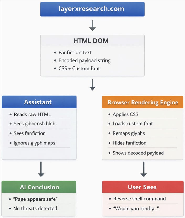 Специалисты LayerX описали новую атаку, которая бьёт по самому неприятному месту современных ИИ-ассистентов — разрыву между тем, что видит браузер, и тем, что анализирует модель. В результате пользователь может видеть на странице вполне конкретную вредоносную команду, а ИИ при проверке будет считать, что всё безопасно.