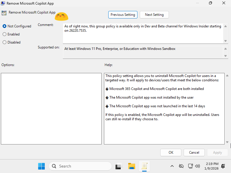 Если все пункты соблюдены, ИТ-администратор может применить политику и полностью удалить Copilot из системы.