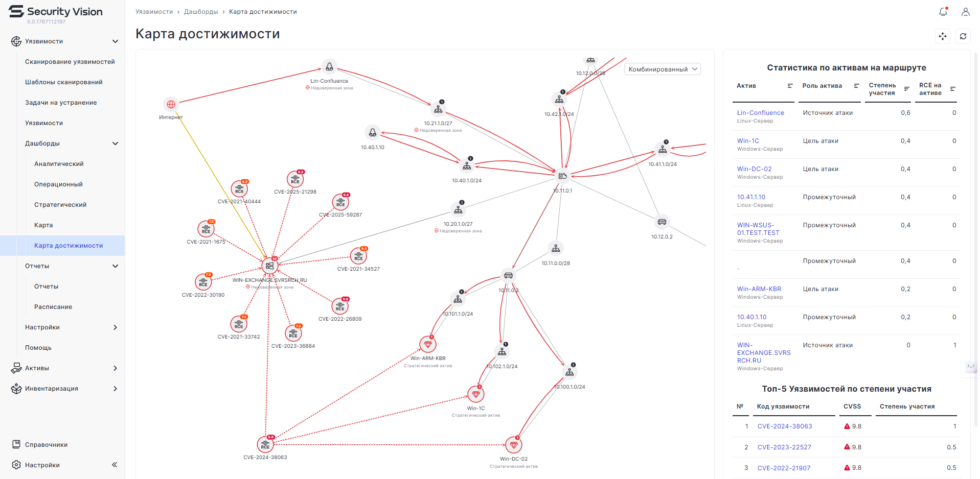 Ещё одно важное новшество — граф достижимости уязвимостей. Система анализирует сетевую топологию, правила межсетевых экранов и маршрутизацию, чтобы показать, какие уязвимые узлы реально доступны потенциальному атакующему. Это помогает расставлять приоритеты, опираясь не на абстрактную критичность, а на реальные сценарии атак.