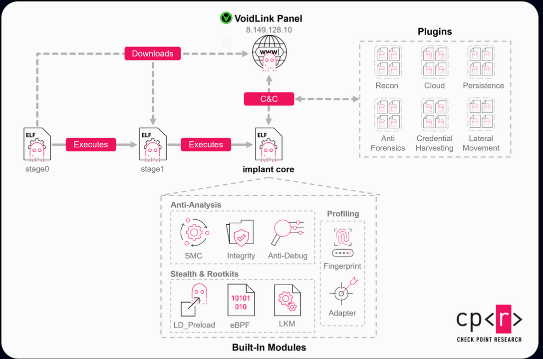 Анализ показал, что VoidLink, как его называют создатели, — это фреймворк, состоящий из загрузчиков, написанного на Zig импланта, руткитов и десятков плагинов, доступных по умолчанию и привязанных к кастомному API. Аналогичный подход наблюдался у Cobalt Strike.