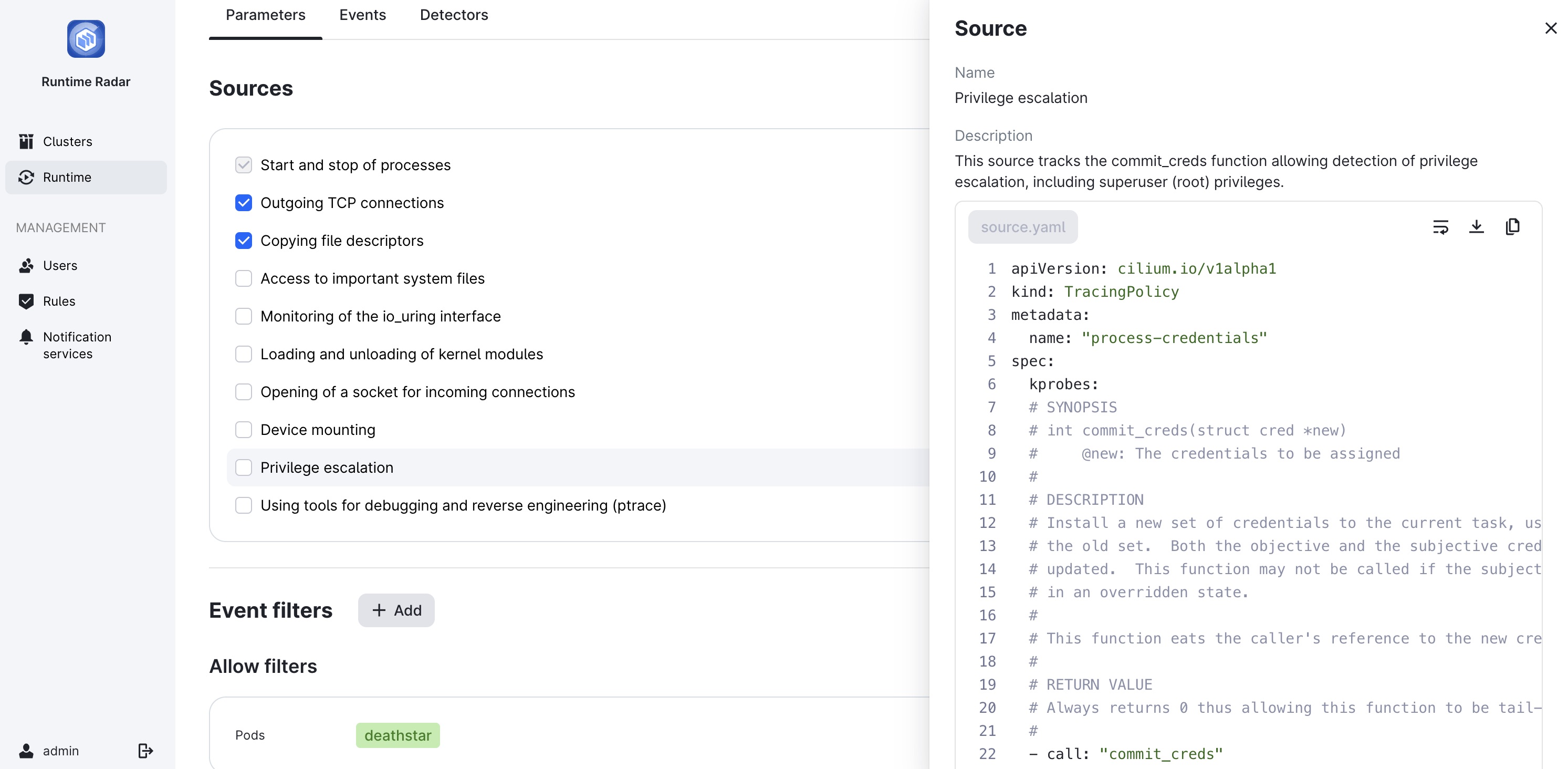 PT Container Security позволяет тонко настраивать сбор событий на уровне ядра Linux, используя различные механизмы получения низкоуровневой телеметрии (kprobe, tracepoint, и т. д.) или системные вызовы, а также применять к полученным событиям контекстные фильтры (процессы, файлы и т. д.) на лету (без перезапуска компонентов).Это даёт пользователям возможность самостоятельно выбирать оптимальный баланс между глубиной мониторинга, потреблением ресурсов и охватом инфраструктуры.