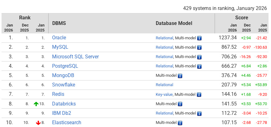 Рисунок 1. Рейтинг DB-Engines по итогам января 2026 года