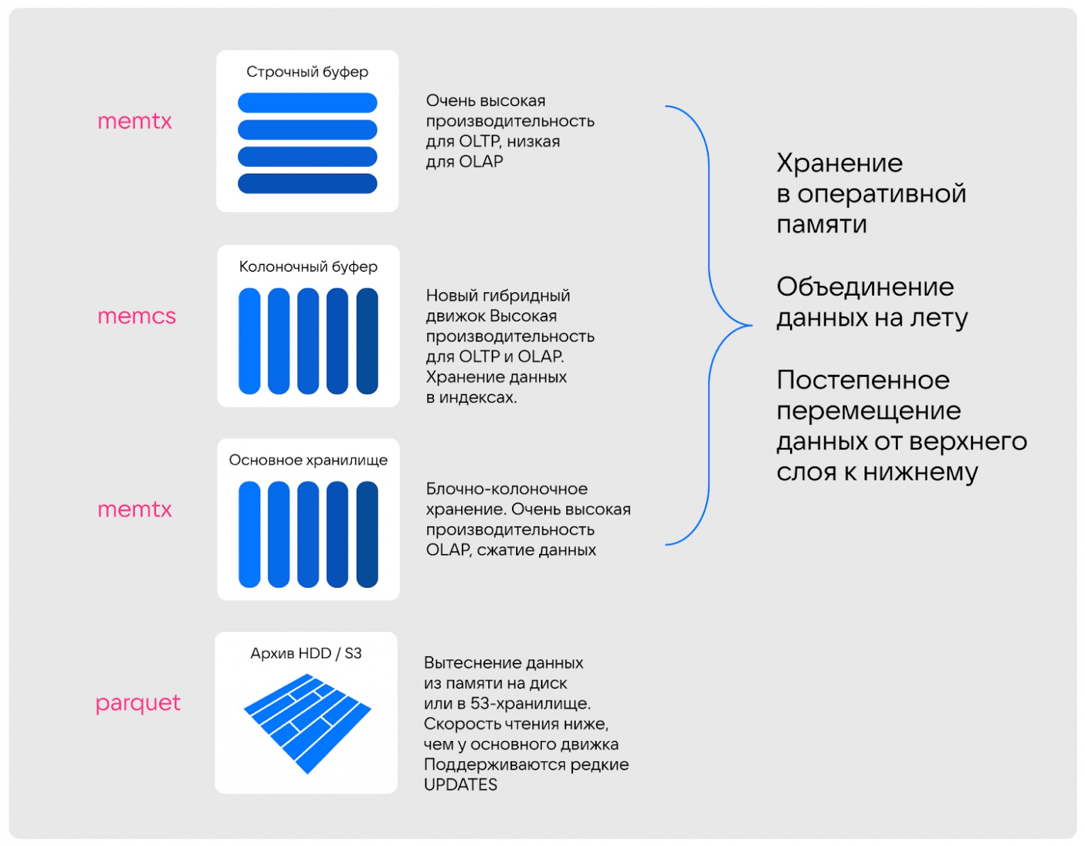 Является in-memory базой, предназначенной для обработки как OLAP-, так и OLTP-запросов в реальном времени. Использует 4 слоя хранения данных (рис. 15), которые включают строчный буфер, колоночный буфер, основное хранилище и внешнее хранилище для архивных и редко используемых данных.