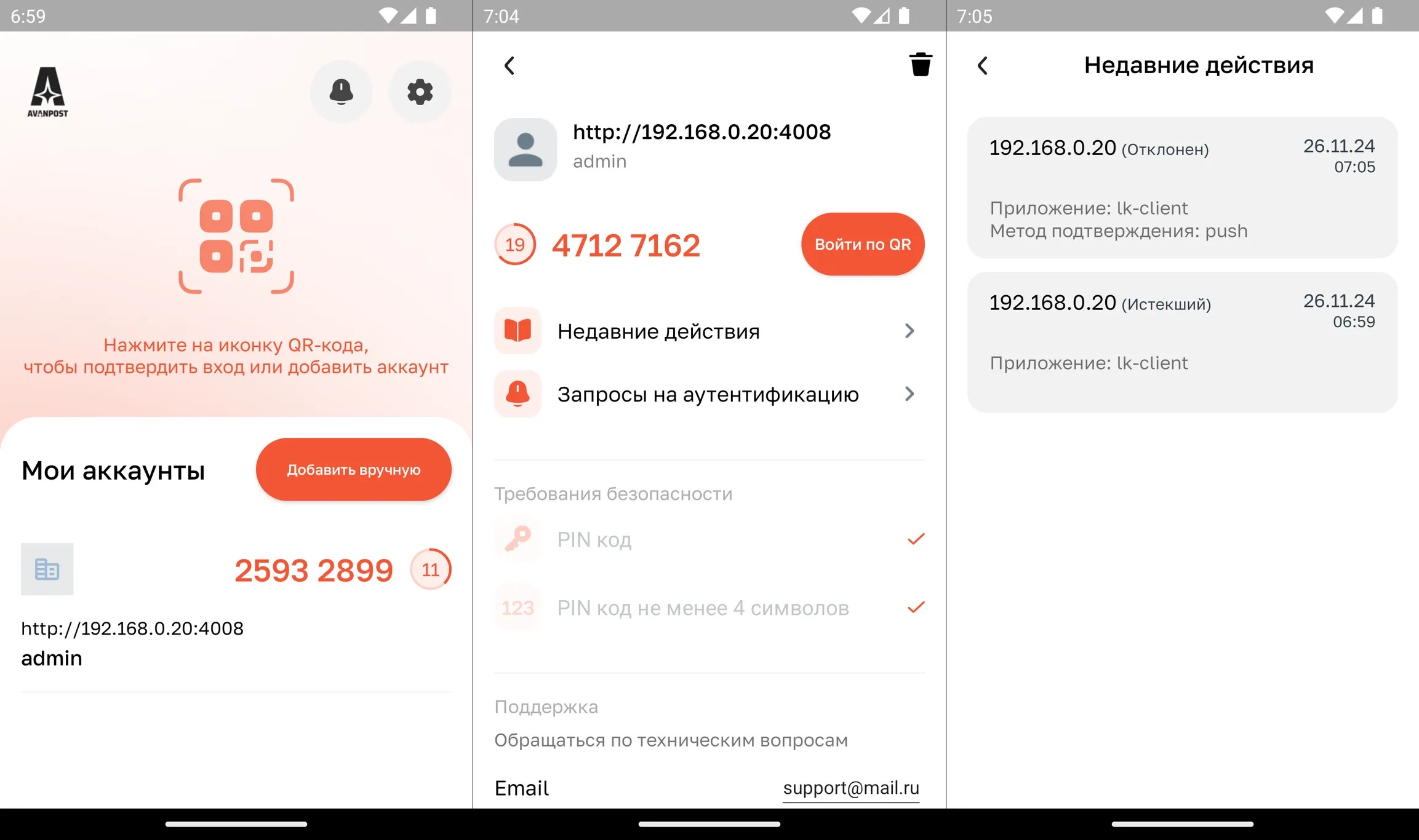 Рисунок 3. Интерфейс мобильного приложения Avanpost Authenticator