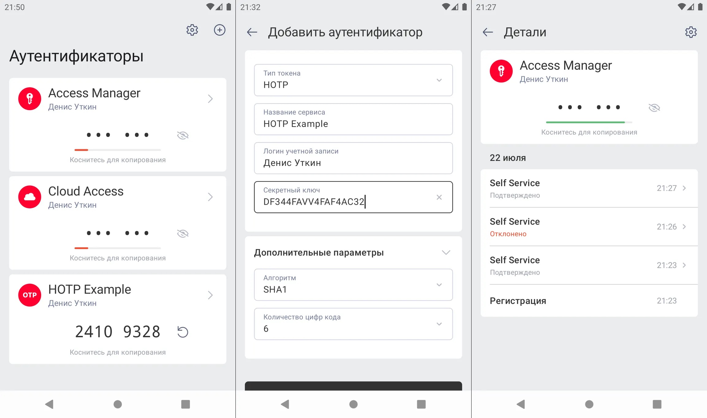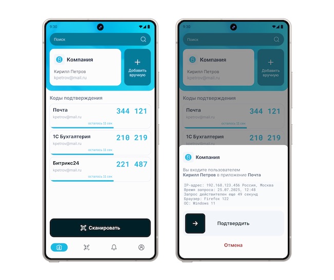 В мобильное приложение приходят TOTP-коды для двухфакторной аутентификации, а также через него можно войти в сервисы без пароля: по отпечатку пальца или лицу, по QR-коду или с помощью картинки. Генерация работает в соответствии с международными стандартами OTP / TOTP.