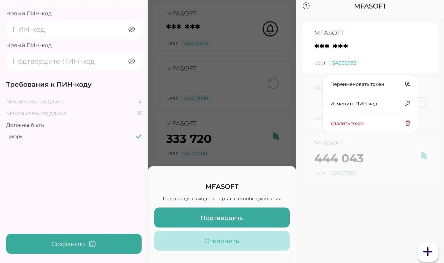 - Поддержка PUSH-аутентификации по модели доверенного устройства с подтверждением входа без ввода одноразового кода.
