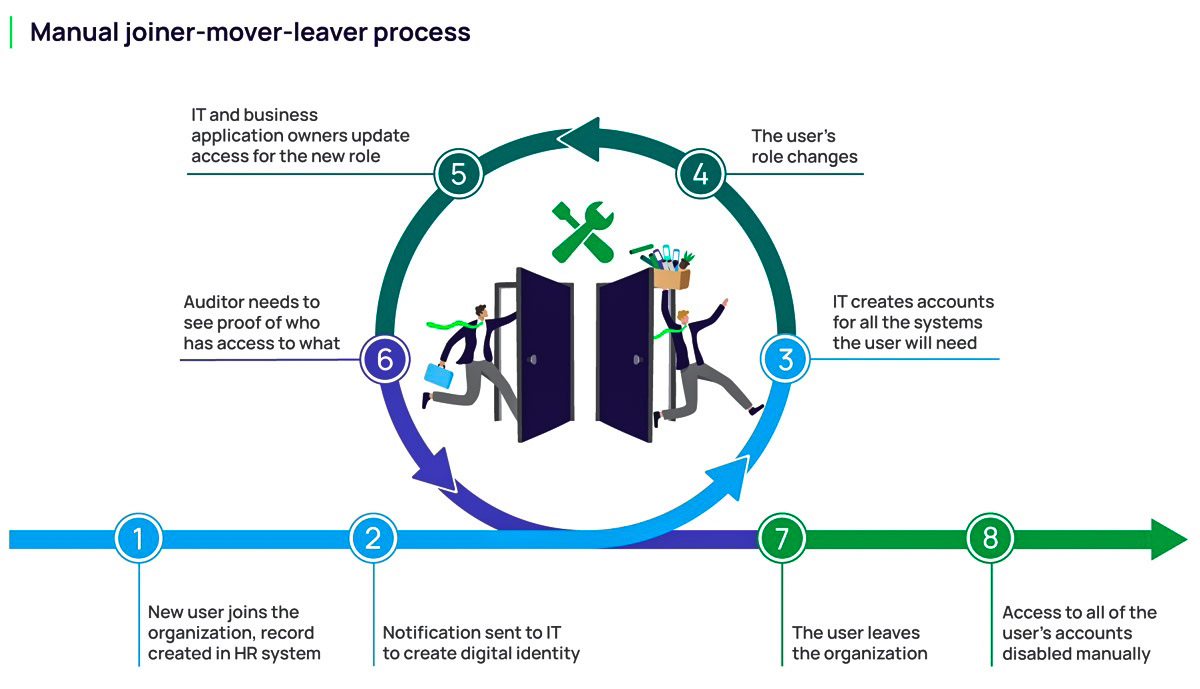 Проблема возникает, когда этим процессом управляют вручную: через почту, тикеты и разрозненные согласования, без автоматической синхронизации с HR-системой. Статус сотрудника в кадровой системе уже может быть изменён, а его аккаунты в Active Directory, облачных сервисах и бизнес-приложениях остаются активными. Так появляются «бесхозные» учётные записи, не привязанные к текущей бизнес-необходимости.
