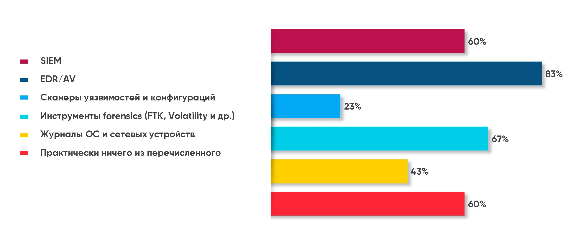 - Инструменты forensics (FTK, Volatility и др.) — 67 %.