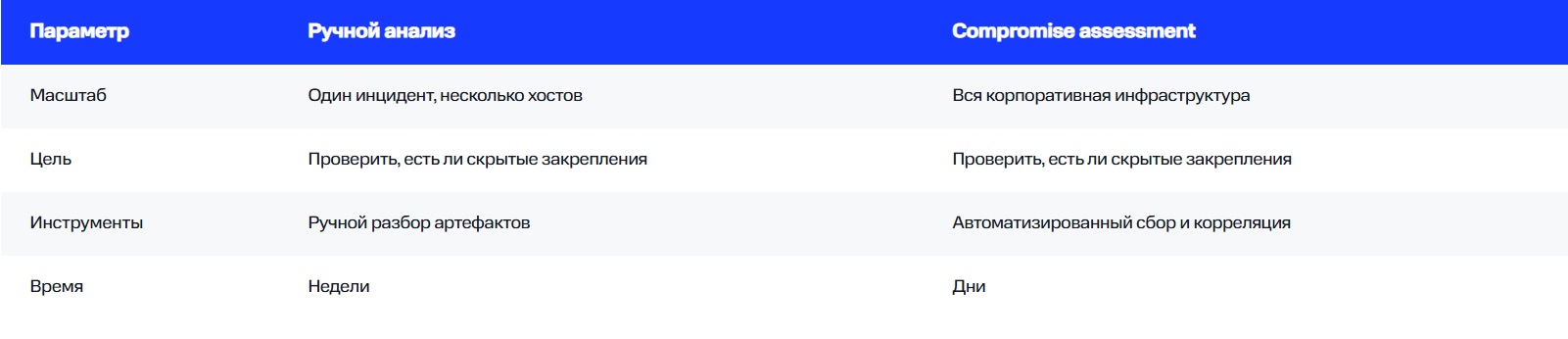 В отличие от расследования инцидентов, где анализ фокусируется на ограниченном числе критически важных систем и на конкретном событии, CA предполагает тотальную проверку всей инфраструктуры. Её цель — убедиться, что в компании нет незамеченных действий злоумышленника.