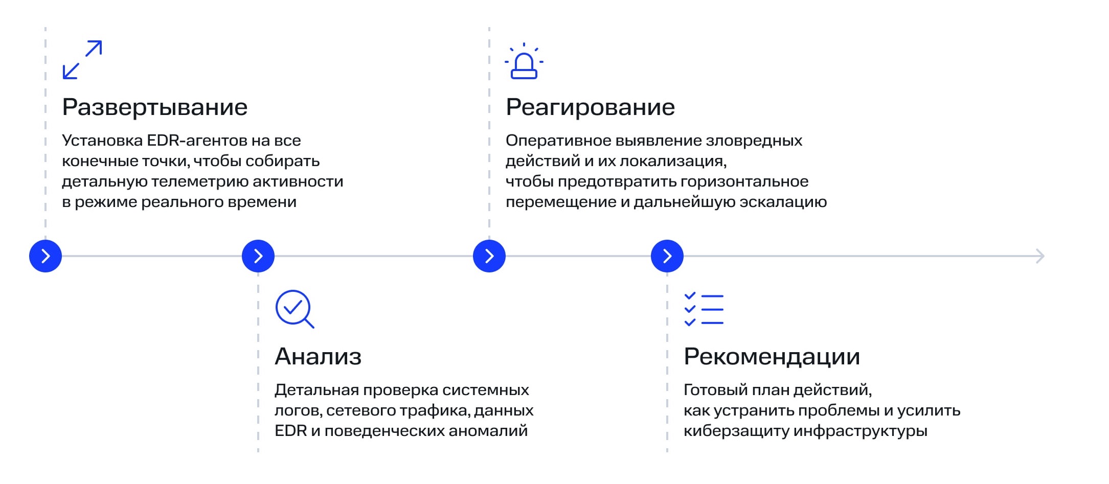 Часто логическим продолжением CA становится внедрение TDR-сервиса, например BI.ZONE TDR. Он позволяет бесшовно перейти к постоянному мониторингу: агенты EDR уже развёрнуты, инфраструктура чиста.