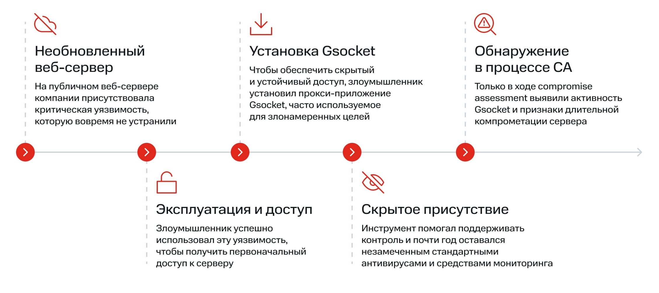 Компания готовилась к внешнему аудиту. Внутренние проверки пройдены, уязвимости закрыты, от нас ждали лишь формальную справку. Но в ходе CA мы нашли два активных туннеля через Gsocket, дающие атакующему доступ в закрытый контур инфраструктуры. Никаких разрушительных действий: злоумышленник просто закрепился и спокойно выгружал данные с заражённых хостов. При этом компания жила с уверенностью, что защищена.