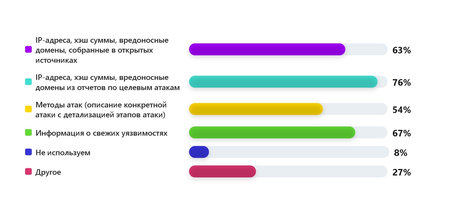 - IP-адреса, хеш-суммы, вредоносные домены, собранные в открытых источниках — 63 %.
