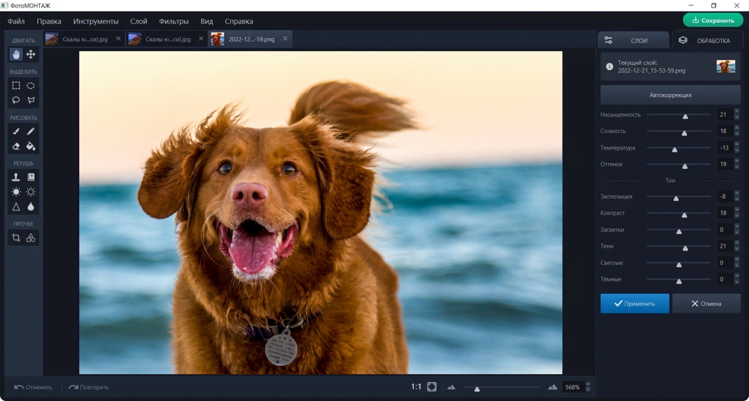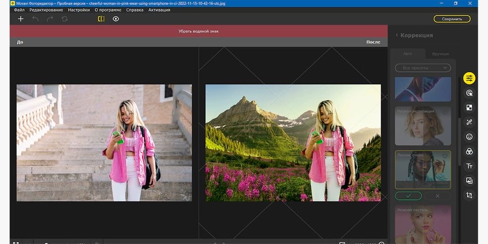 ФотоМОНТАЖ сочетает как автоматизированные инструменты коррекции изображений, в том числе нейросетевые (только в случае покупки самой дорогой лицензии «Профи»), так и ручные.