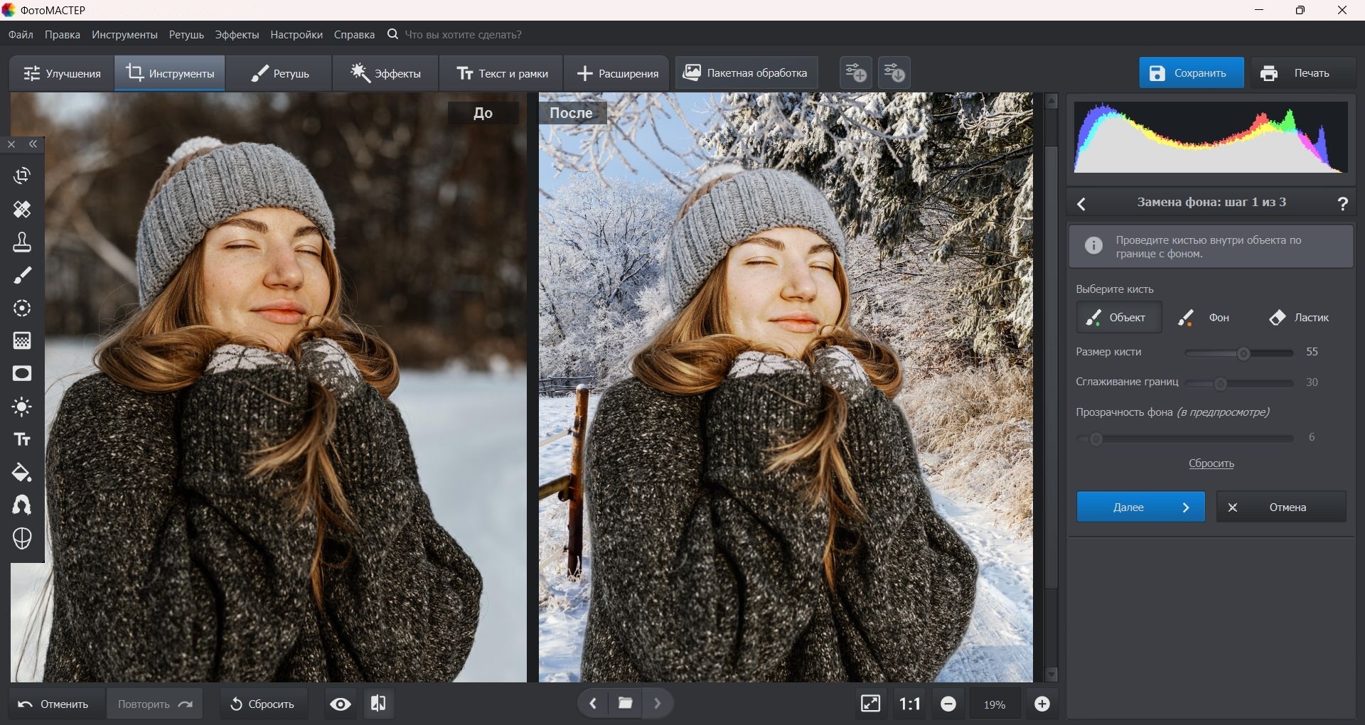 Как и в ФотоМОНТАЖе, в ФотоМАСТЕРе есть большое количество автоматизированных инструментов, позволяющих устранить основные дефекты изображения нажатием буквально одной кнопки. Они заметно облегчают такие трудоёмкие задачи, как ретушь, перекрашивание, замена или удаление фона, устранение графического шума.