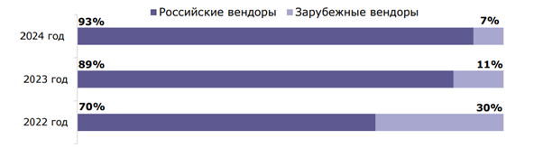 Рисунок 1. Рост доли российских вендоров и снижение доли зарубежных вендоров средств защиты информации с 2022 по 2024 год. Источник: ЦСР.