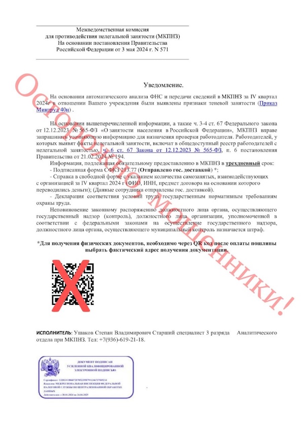 В феврале 2025 года в отношении российских компаний была предпринята не вполне стандартная фишинговая атака. В ряде регионов произошла массовая рассылка писем (рис. 3) от имени различных контролирующих органов, в основном Государственной инспекции труда. В них утверждалось, что компания допустила различные нарушения, в основном связанные с использованием труда мигрантов, и предлагалось через QR-код оплатить «почтовые расходы».