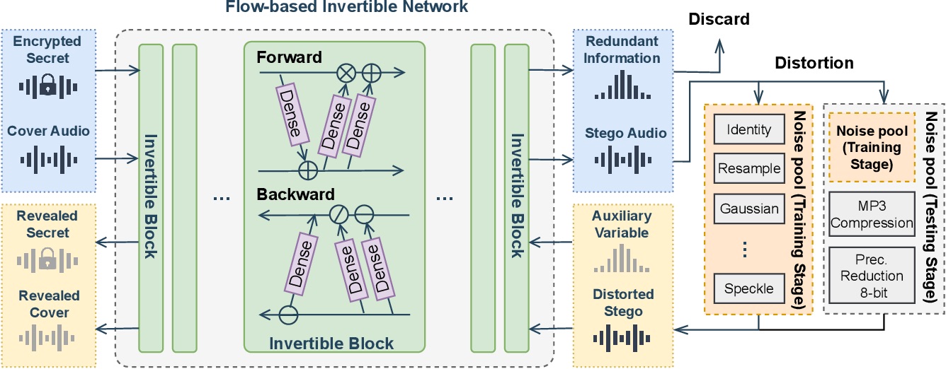 InvASNet (Invertible Audio Steganography Network) — пример такой модели. Она раскладывает аудио на компоненты (например, на низкочастотные и высокочастотные составляющие) и встраивает секретное сообщение в высокочастотную полосу. Высокочастотные компоненты менее заметны для человеческого слуха, поэтому искажения минимальны. При этом благодаря обратимости модели можно восстановить исходный аудиосигнал с минимальным искажением после извлечения сообщения.