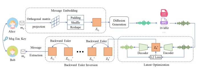 Аудио не модифицируется, а создаётся заново с заложенной информацией. Сообщение кодируется во внутреннем представлении модели и влияет на синтез звука. Нет оригинала и изменённой версии, нет локальных артефактов внедрения, устойчивость выше.