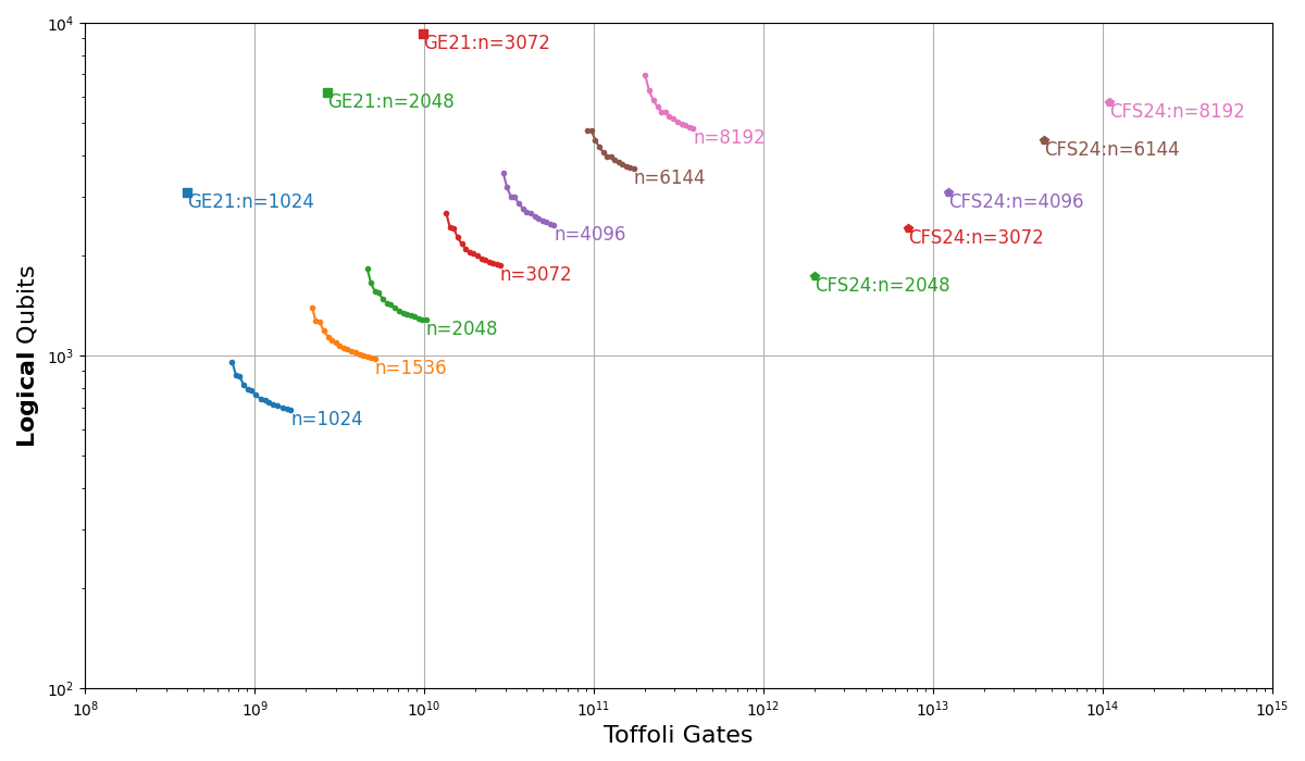 Рисунок 1. Динамика оценки числа физических кубитов для факторизации RSA-2048 алгоритмом Шора (Источник: arXiv)