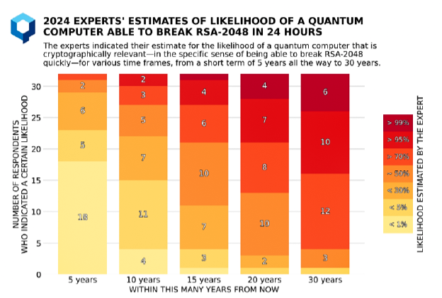 По данным опроса Global Risk Institute, вероятность появления криптографически релевантного квантового компьютера (способного взломать реальный RSA-2048 за приемлемое время) к 2034 году составляет 34 % — вдвое выше, чем 2 года назад.