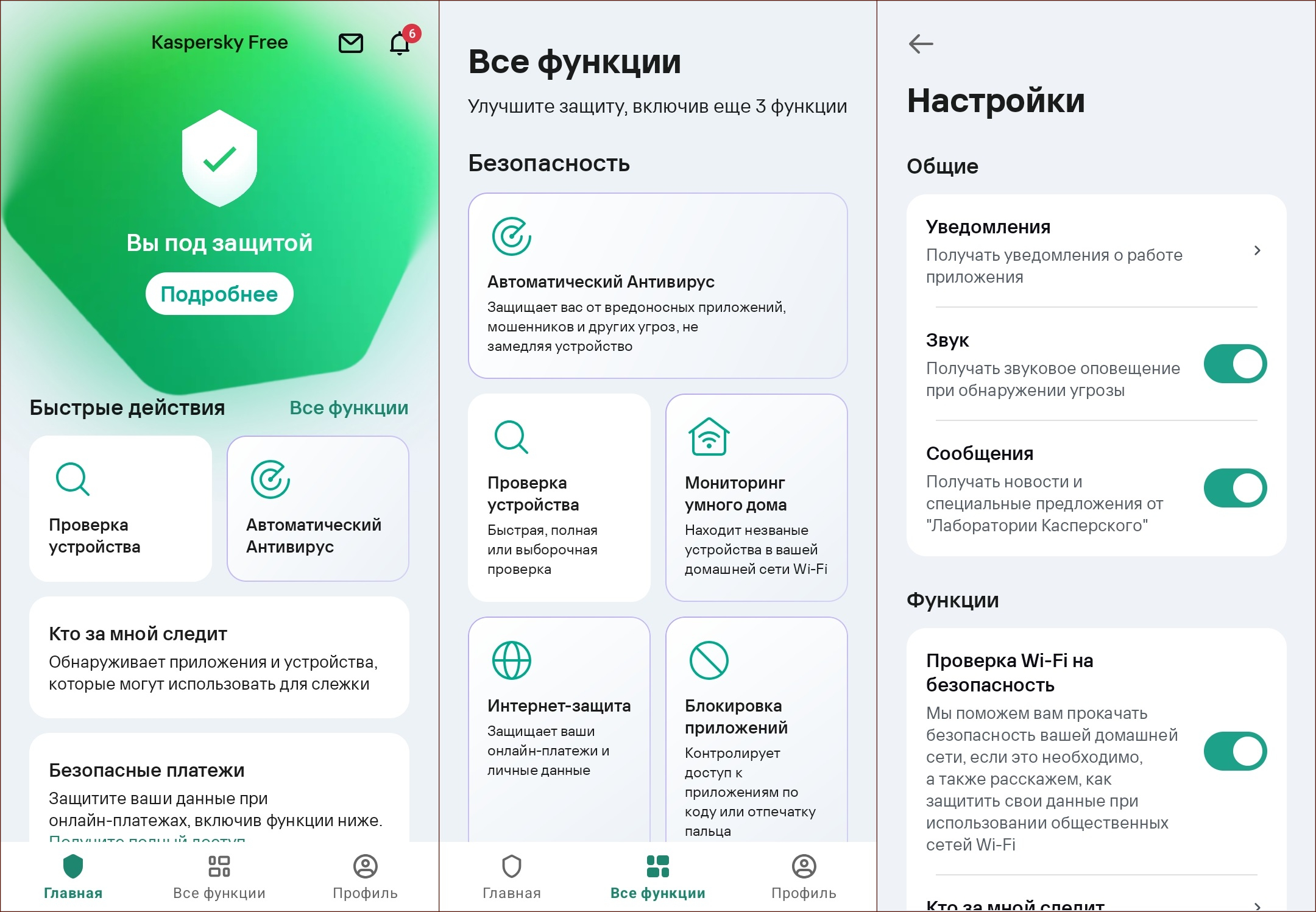 Бесплатная версия предлагает сканирование на вирусы вручную, поиск небезопасных настроек телефона, безопасный QR-сканер, обнаружение слежки, поиск утечек данных пользователя, а также механизм управления приложениями. Кроме того, имеется антивор, который позволяет дистанционно заблокировать устройство или сделать снимок злоумышленника. При оплате подписки появляется ряд дополнительных функций, таких как автоматический антивирус, антифишинг, безопасная работа в интернете и пр.