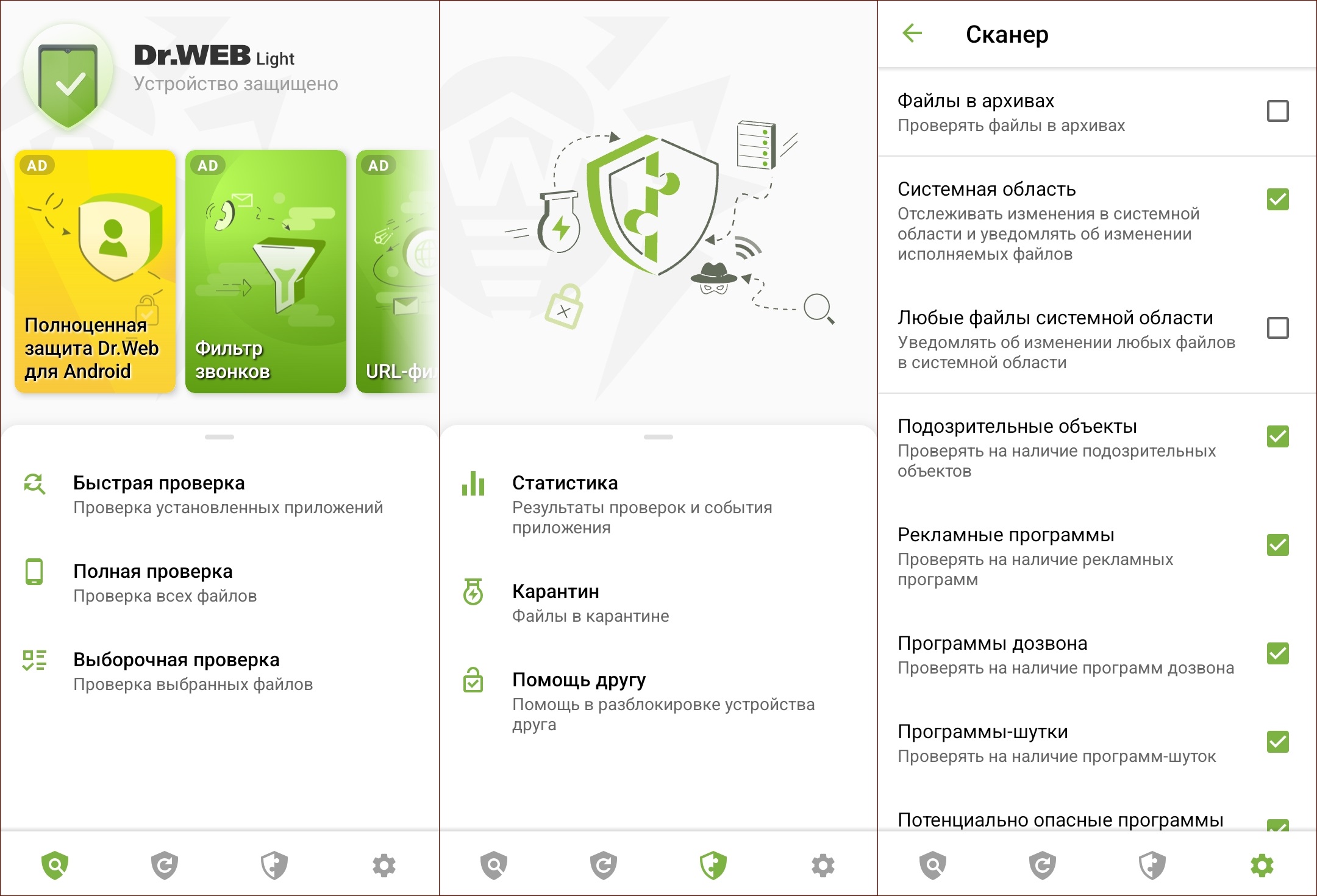 Бесплатная версия содержит только антивирусный сканер. Другие модули доступны в коммерческом приложении Dr.Web Security Space