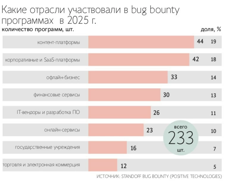 Параллельно росло и число самих программ баг-баунти. К концу 2025 года на платформе Positive Technologies действовало 233 программы — в 2,2 раза больше, чем годом ранее. У BI.ZONE их стало 150, что в полтора раза больше, чем в 2024 году.