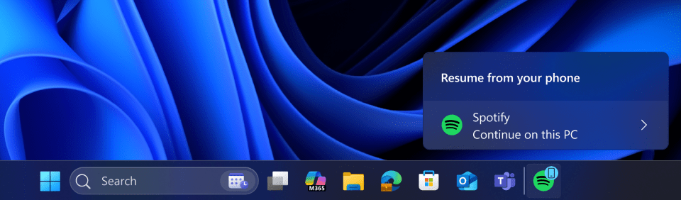Визуально это реализовано просто: Windows 11 предлагает продолжить активность, начатую на телефоне, — например, одним кликом возобновить проигрывание трека в Spotify или открыть документ, над которым вы работали.