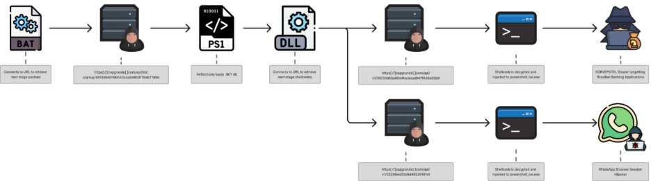 Как только пользователь открывает архив на компьютере, запускается LNK-файл (ярлык Windows), который в фоне активирует PowerShell-скрипт. Этот скрипт загружает основной вредоносный компонент с внешнего сервера (например, sorvetenopoate[.]com) и прописывает его в автозагрузку Windows. После перезагрузки система снова запускает зловред, который связывается с управляющим сервером для получения новых команд.