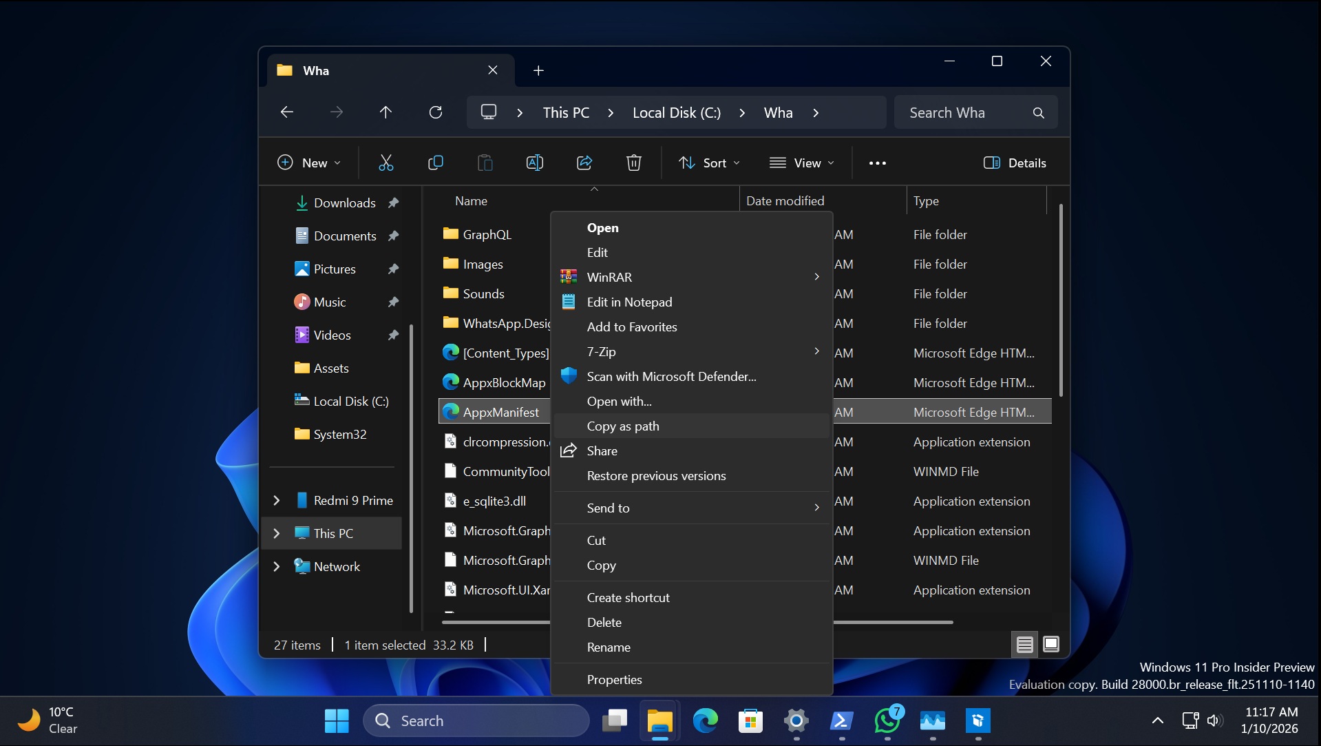 • перед сохранением нужно распаковать MSIX-пакет с помощью 7-Zip ещё раз и найти файл AppManifest.xml, на нём нажимаем правой кнопкой мыши и выбираем «копировать путь»;