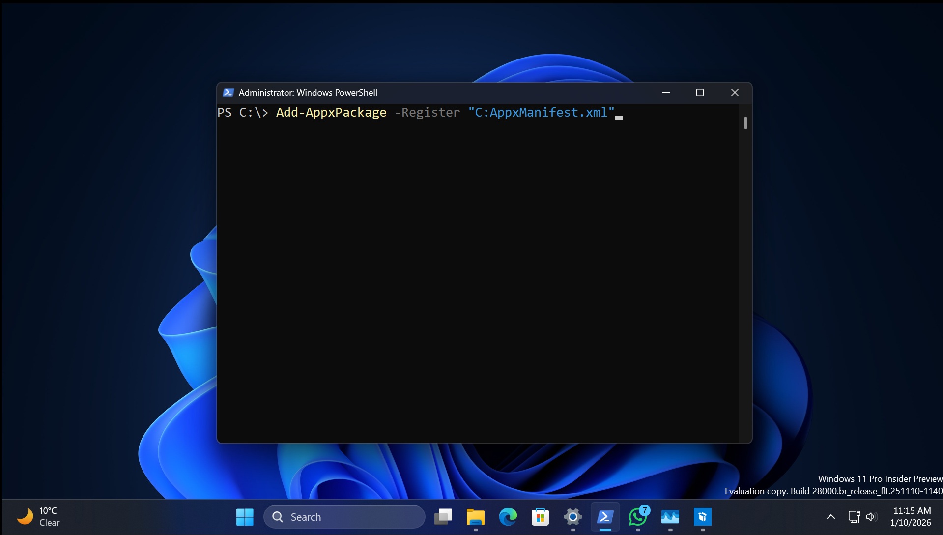 • набрать в окне PowerShell Add-AppxPackage -Register и вставить скопированный на предыдущем шаге путь (в показанном примере юзер положил файл в корень диска C);