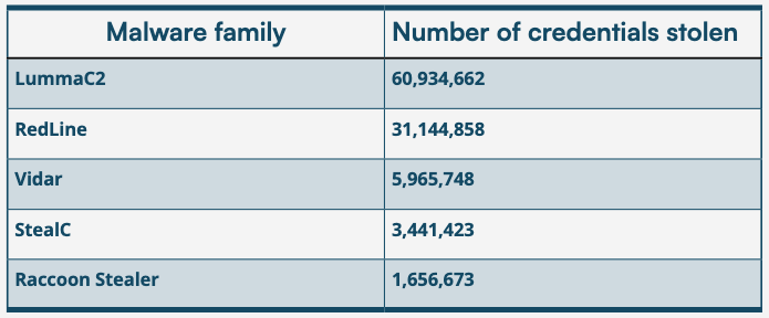 Большая часть этих учётных данных была похищена с помощью зловредов. Самыми «продуктивными» оказались инфостилеры Lumma и RedLine, которые продолжают активно собирать логины и пароли пользователей по всему миру.