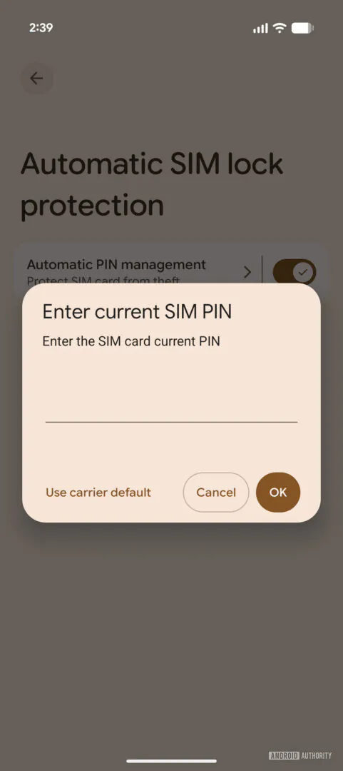 Работает всё просто: пользователь включает опцию «Автоматическое управление ПИН-кодом», затем подтверждает действие кодом устройства или биометрией. После этого Android просит ввести текущий ПИН-код от сим-карты. Если он ещё не настроен, система может предложить использовать стандартный код оператора. Обычно это что-то вроде 0000, 1234 или 1111.