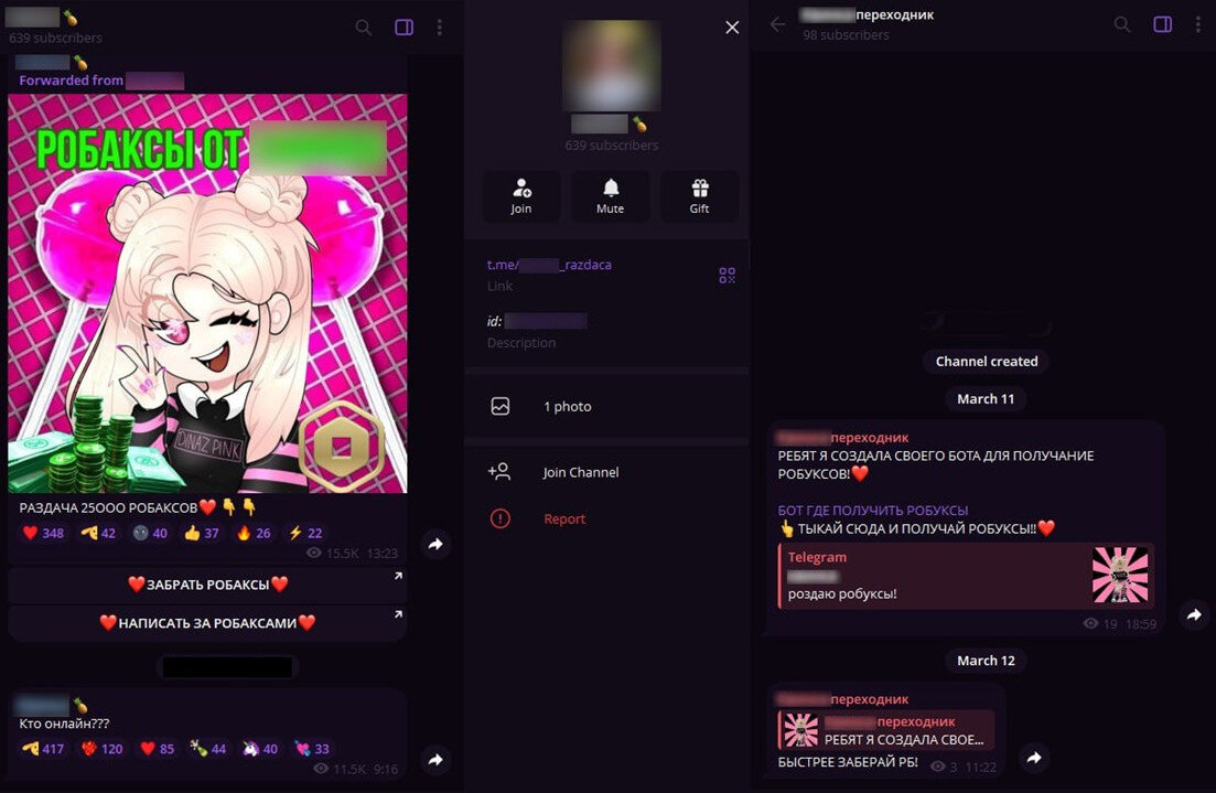 Параллельно специалисты фиксируют ещё одну связанную схему — уже с угоном аккаунтов Roblox и мессенджеров. В фейковых каналах тех же «блогеров» пользователям предлагают поучаствовать в розыгрыше робуксов, а затем через бота просят ввести номер телефона и код двухфакторной аутентификации. После этого аккаунт фактически уходит в руки злоумышленников.