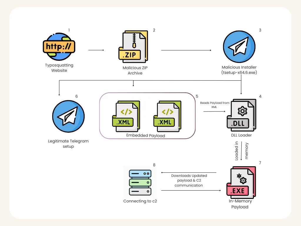 Пользователь видит, что Telegram установился, и может не заметить, что параллельно в системе уже работает совсем другой процесс.