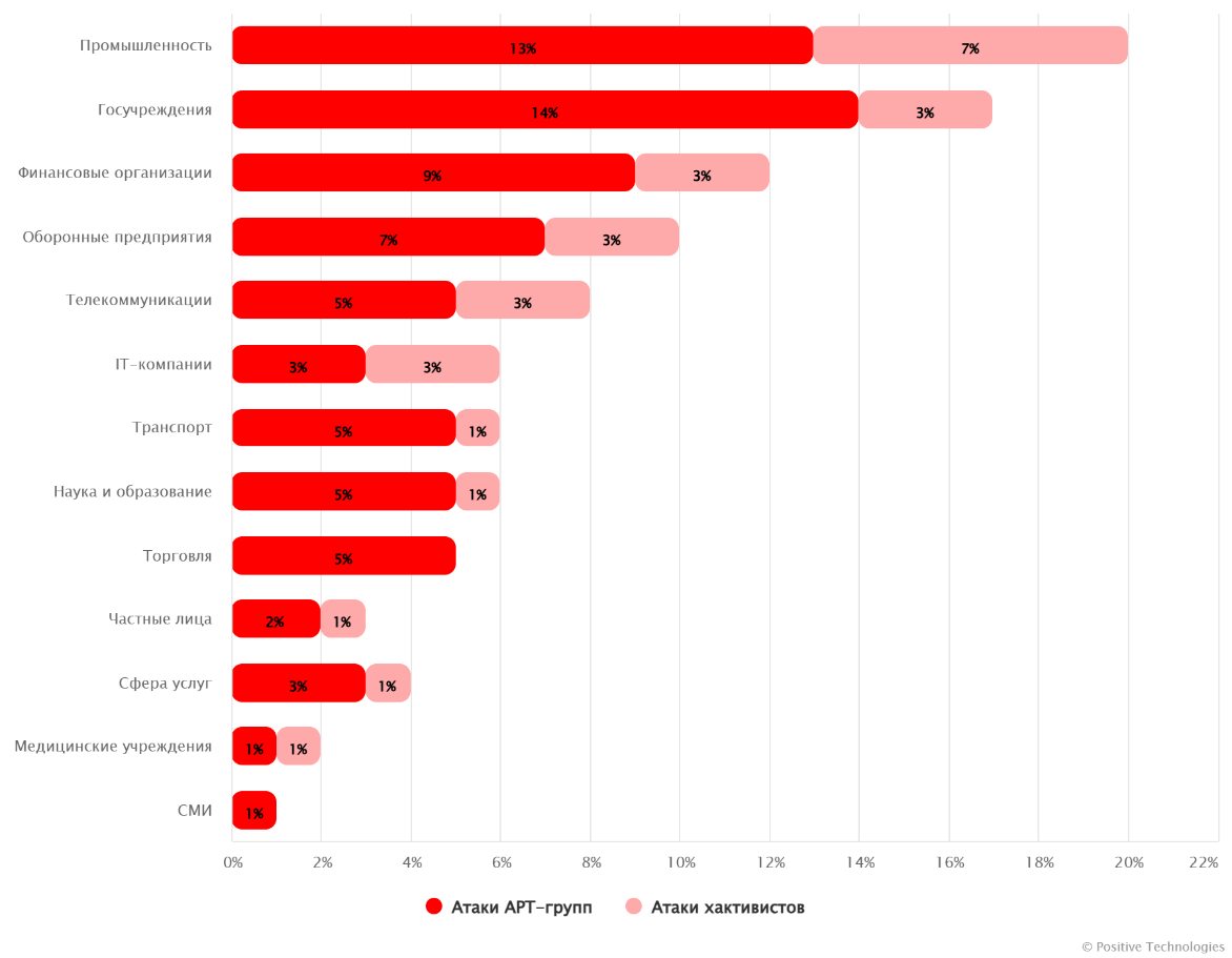 Главными целями атак оставались вполне ожидаемые отрасли: промышленные предприятия, госструктуры и финансовые организации. На них пришлось почти половина всех зафиксированных инцидентов. Причём промышленность вообще оказалась одной из самых интересных мишеней для большинства группировок.