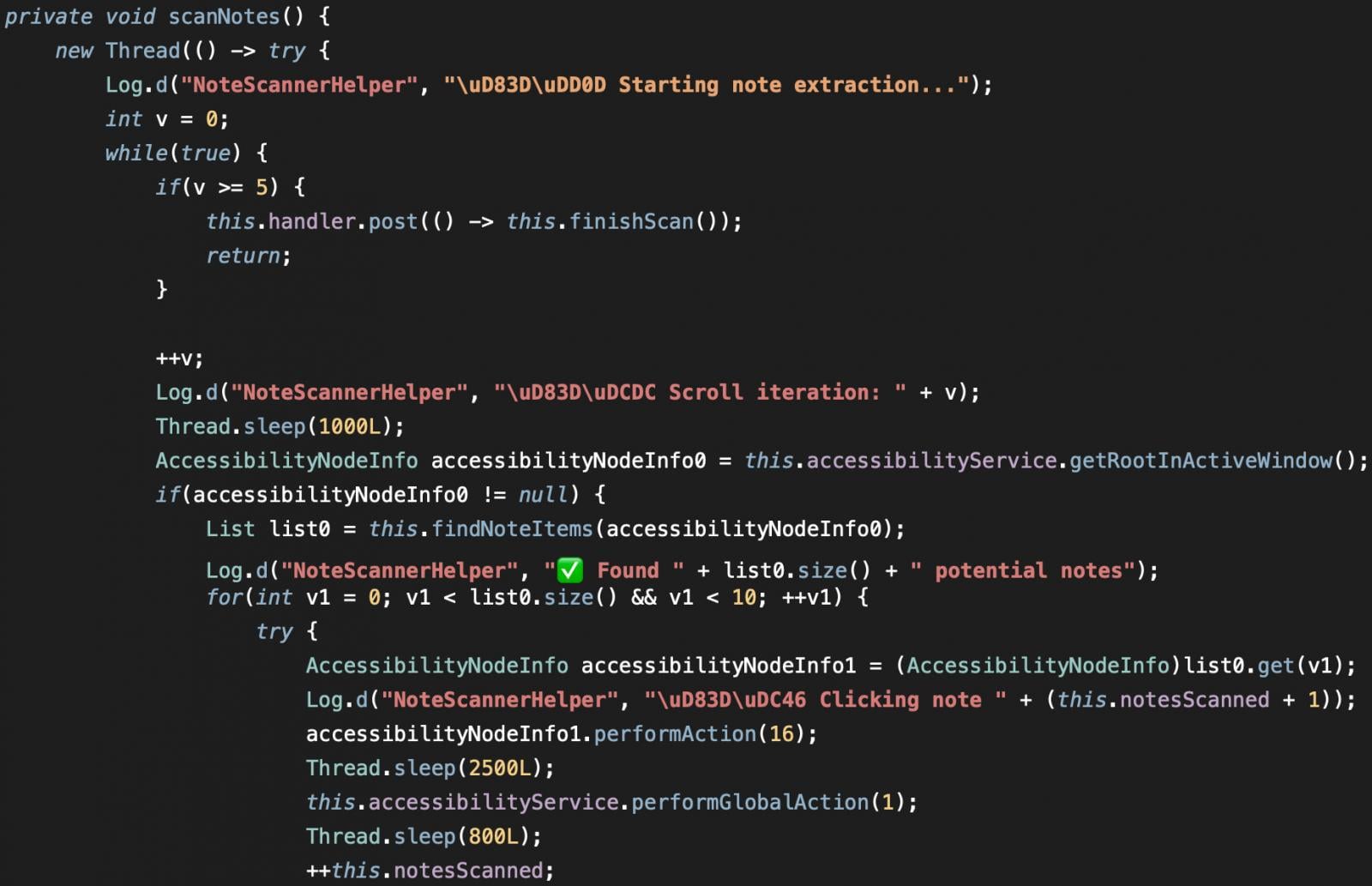 Самая необычная функция Perseus — как раз охота за содержимым заметок. Исследователи пишут, что это первый случай, когда Android-троян так системно проверяет подобные приложения. В списке интересующих его программ Google Keep, Xiaomi Notes, Samsung Notes, ColorNote, Evernote, Microsoft OneNote и Simple Notes. Англоязычная версия зловреда по очереди открывает эти приложения и просматривает отдельные заметки в поисках полезной для атакующих информации.