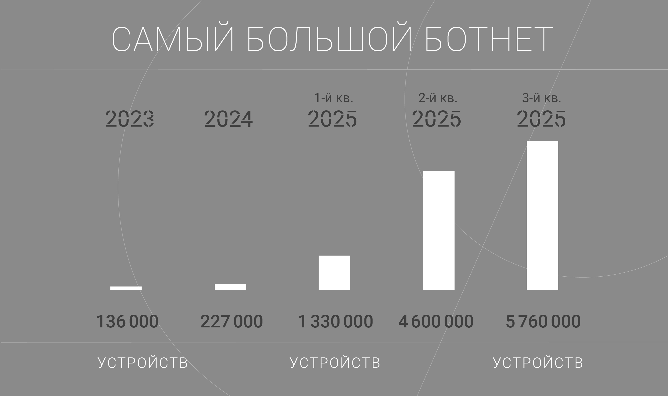 Для сравнения: в прошлом году крупнейший ботнет включал всего около 227 тысяч устройств, то есть масштаб вырос более чем в 25 раз.