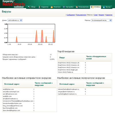 Всего за время тестирования на ящики домена @anti-malware.ru попало 13 вирусов (0.09% от всего почтового трафика), все они (включая несколько вариантов червя Email-Worm.Win32.Warezov) были успешно детектированы сервисом Kaspersky Hosted Security и помещены в карантин. Уровень детектирования вирусов - 100%.