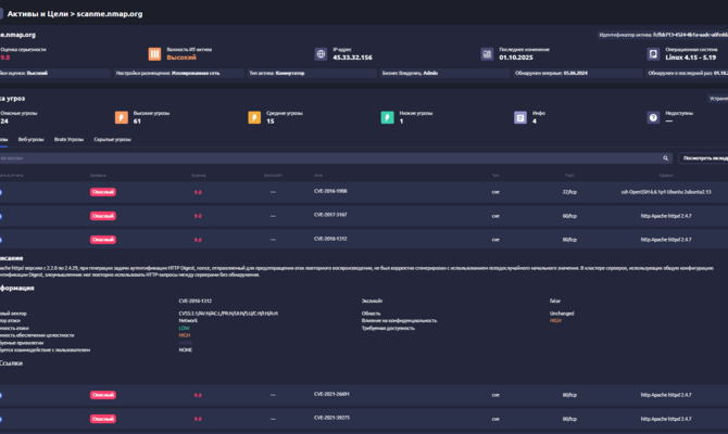 - Эксплуатация уязвимостей. Модуль подбора эксплойтов и проверки уязвимостей помогает удостовериться в реализации рисков, обнаруженных на этапе сканирования.