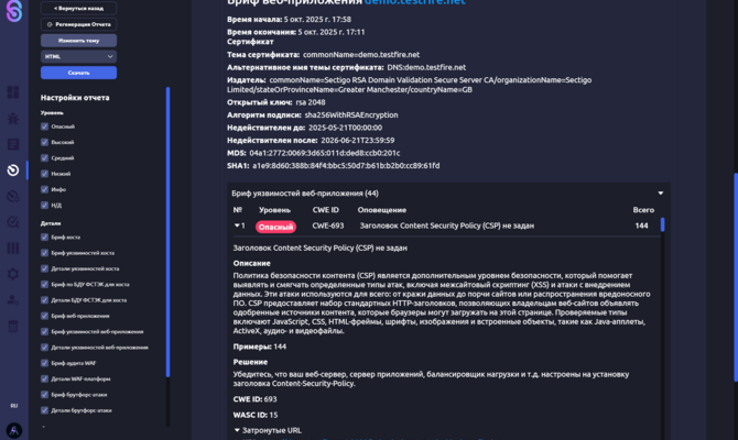 - Обнаружение и определение типа межсетевого экрана веб-приложений (WAF). Сканер выявляет наличие продукта и определяет его сигнатуры. На базе полученных данных проводит полноценный тест на проникновение, спланировав сценарии обхода защиты.