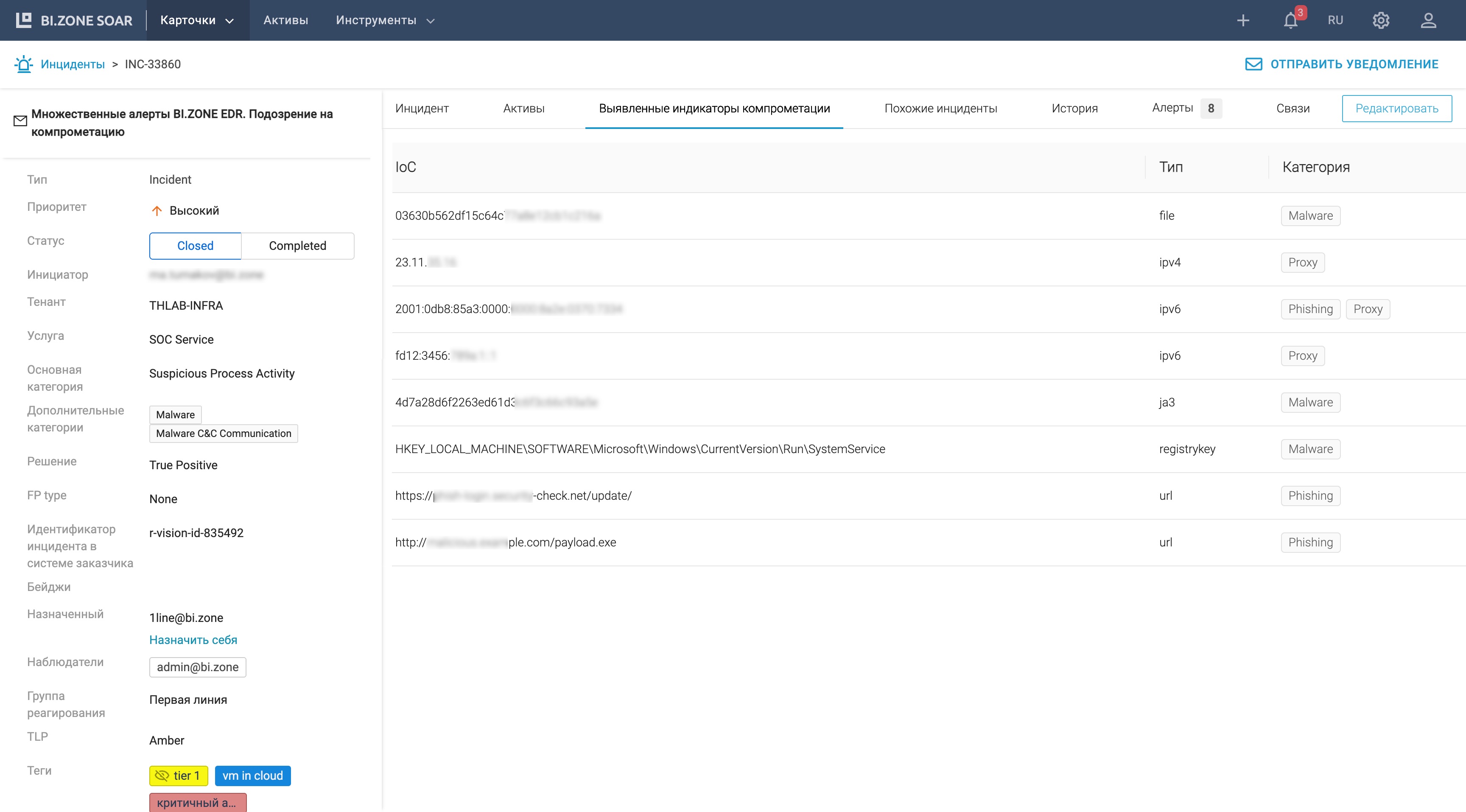 Одновременно с развитием платформы рос и сам SOC в BI.ZONE. Сегодня он является одним из крупнейших центров мониторинга в России и других странах СНГ, который круглосуточно обслуживает более 150 заказчиков. Ядром архитектуры SOC в BI.ZONE остается BI.ZONE SOAR — единая точка взаимодействия между аналитиками, клиентами и внешними системами.