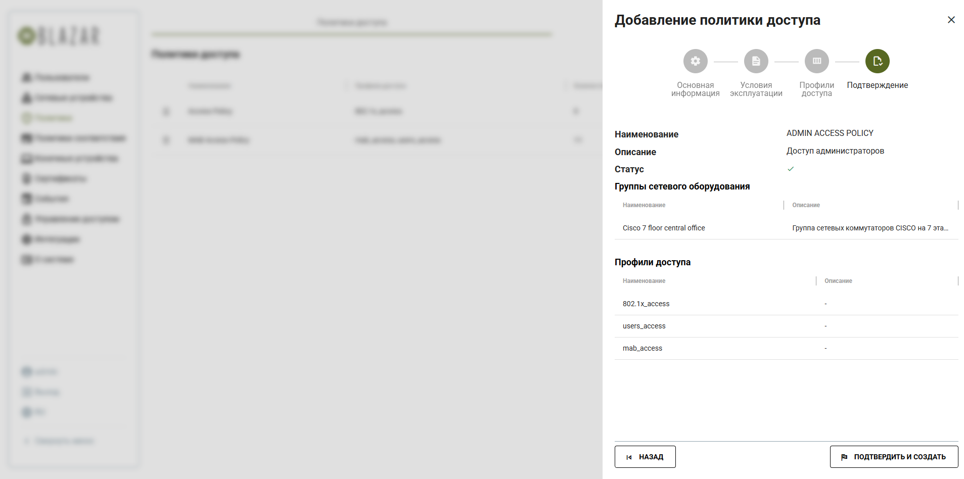 Рисунок 28. Подтверждение создания новой политики доступа в Blazar NAC 1.1